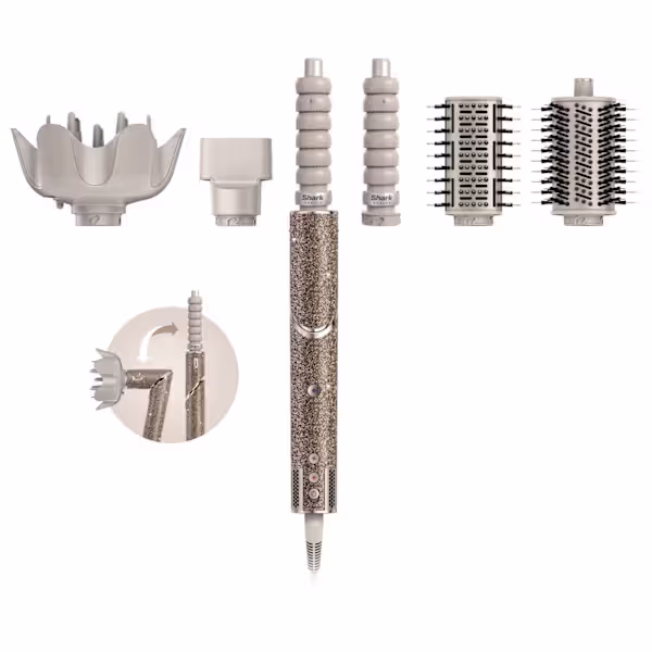 Ved at dreje én gang skifter Shark FlexStyle mellem en kraftig hårtørrer og en 5-i-1-airstyler. Krøl, udglat, giv mere fylde, gør blødere, og definér med fem stykker tilbehør til styling: